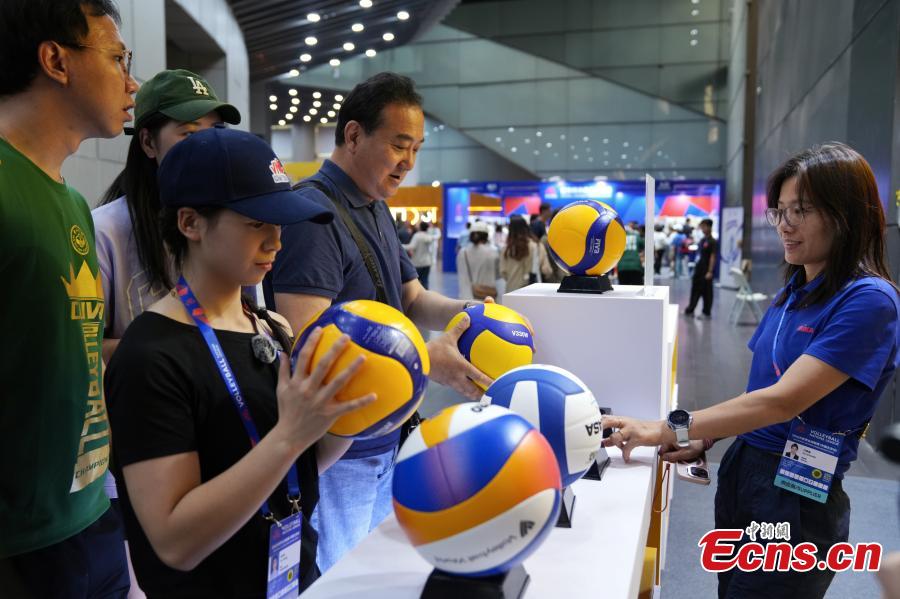 Consumers learn about volleyball-related products at the official merchandise store of the FIVB Volleyball Nations League (VNL) at the National Indoor Stadium in Beijing, China, June 8, 2025. (China News Service/Zhang Xiangyi)