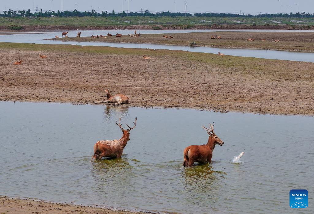 A herd of milu deer are seen at the Dafeng Milu National Nature Reserve in east China's Jiangsu Province, June 7, 2025.(Xinhua/Liu Dawei)