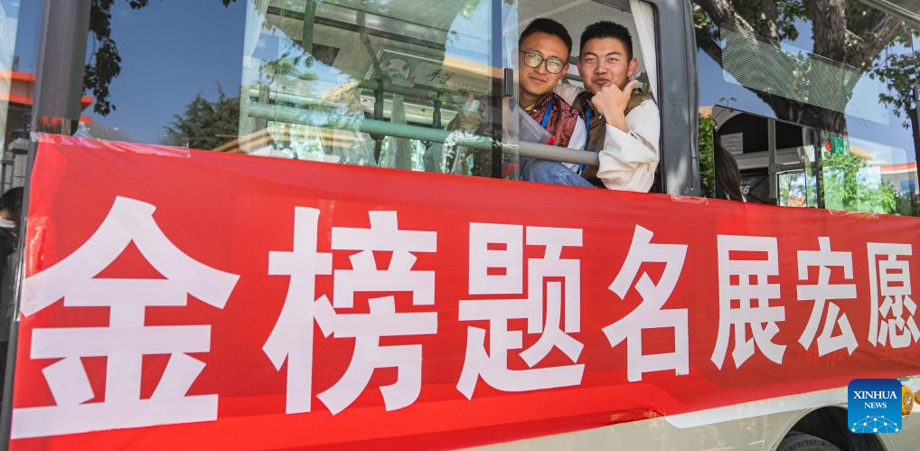 Students take a bus to leave after the exam at a national college entrance examination site in Lhasa, southwest China's Xizang Autonomous Region, June 9, 2025. China's national college entrance exam, also known as the gaokao, began on June 7 this year. The exam in some regions has ended on Monday. (Xinhua/Tenzin Nyida)