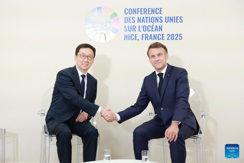 Chinese Vice President Han Zheng meets with French President Emmanuel Macron on the sidelines of the third UN Ocean Conference (UNOC) in Nice, France, June 9, 2025. (Xinhua/Ding Haitao)