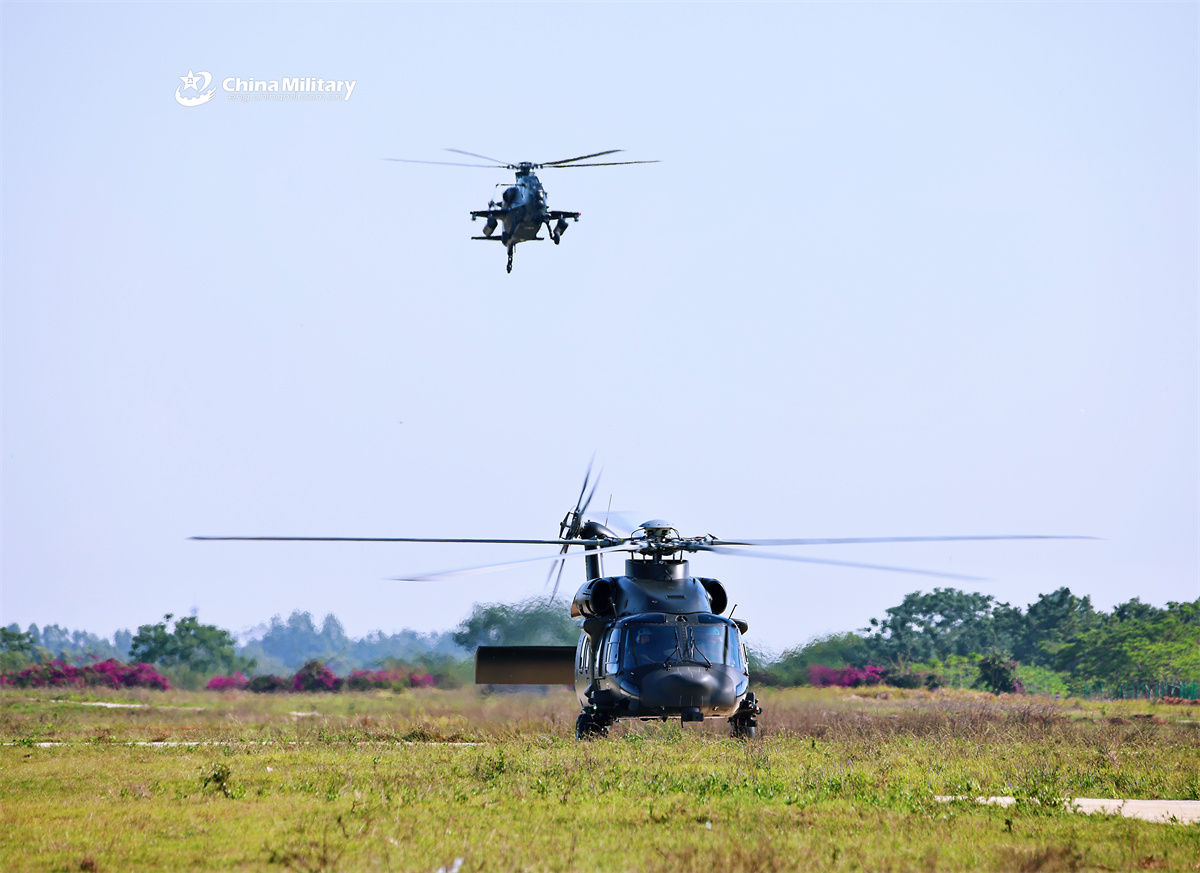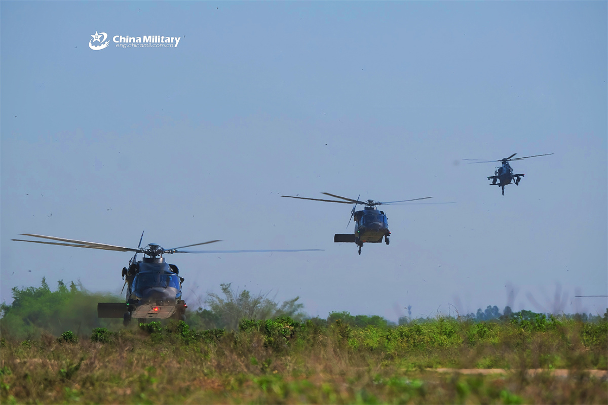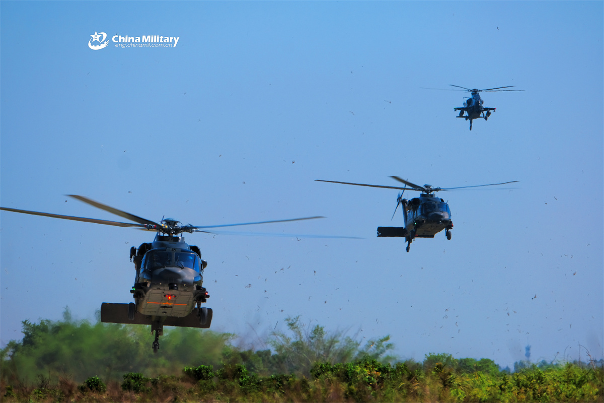 A group of helicopters attached to an army aviation brigade under the Chinese PLA 75th Group Army lift off successively for a flight training exercise in late May, 2025. (eng.chinamil.com.cn/Photo by Cao Yiqing)
