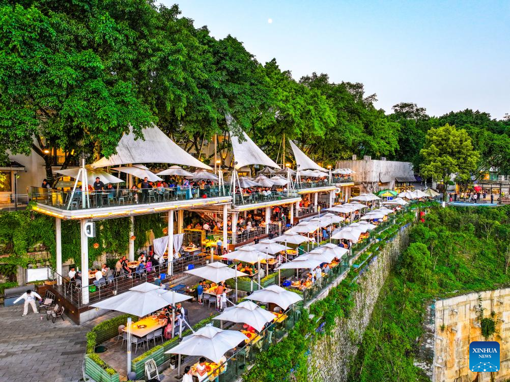 An aerial drone photo taken on May 10, 2025 shows customers enjoying hot pot at a restaurant in southwest China's Chongqing Municipality. In recent years, Chongqing has made efforts to enrich its consumption forms in line with its existing tourism resources, as a way to provide better consumption experience for customers and unleash market potential. (Xinhua/Wang Quanchao)