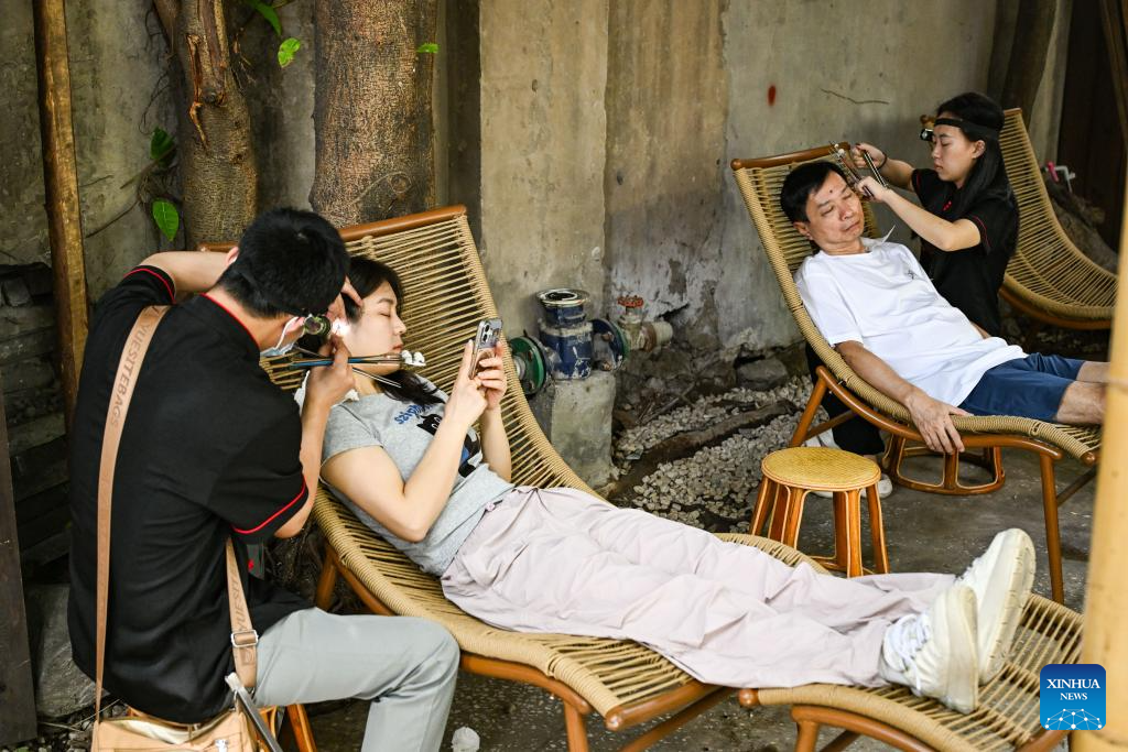 Customers try ear cleaning service in Yuzhong District, southwest China's Chongqing Municipality, June 8, 2025. In recent years, Chongqing has made efforts to enrich its consumption forms in line with its existing tourism resources, as a way to provide better consumption experience for customers and unleash market potential. (Xinhua/Wang Quanchao)