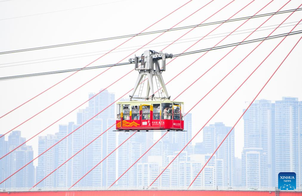Tourists take a cable car to enjoy the scenery in southwest China's Chongqing Municipality, June 7, 2025. In recent years, Chongqing has made efforts to enrich its consumption forms in line with its existing tourism resources, as a way to provide better consumption experience for customers and unleash market potential. (Xinhua/Wang Quanchao)