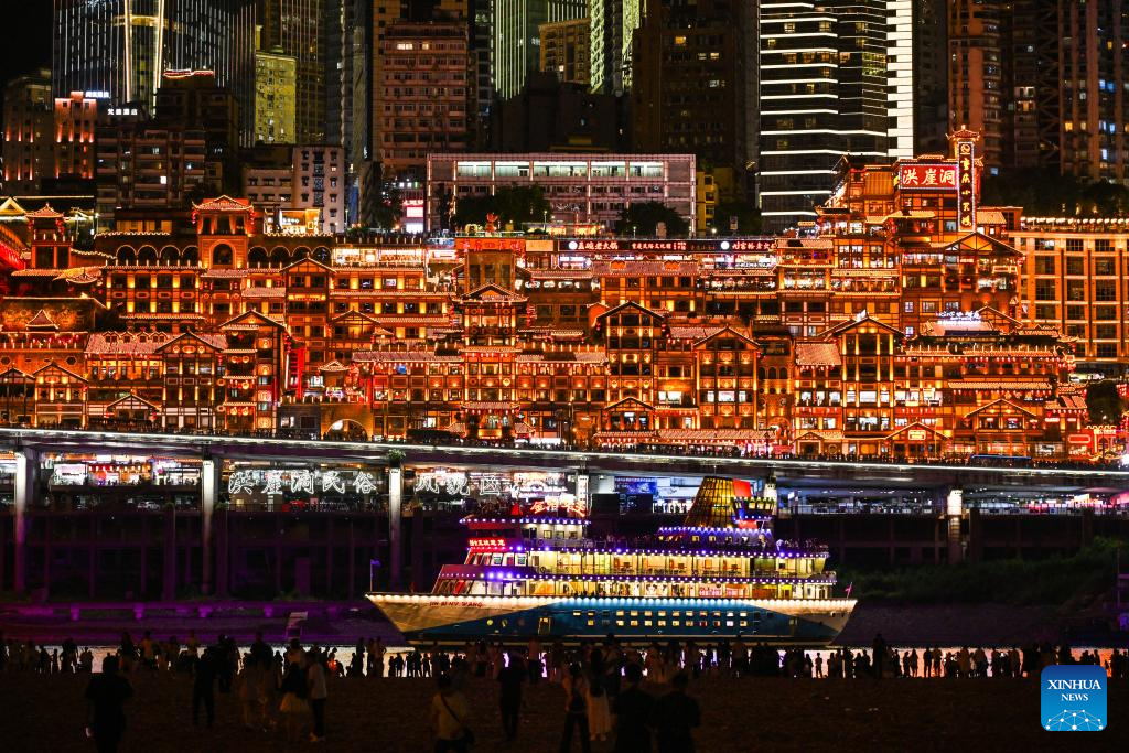 Tourists take a cruise ship to enjoy the night view in southwest China's Chongqing Municipality, May 28, 2025. In recent years, Chongqing has made efforts to enrich its consumption forms in line with its existing tourism resources, as a way to provide better consumption experience for customers and unleash market potential. (Xinhua/Wang Quanchao)