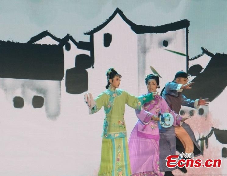 Photo taken on June 9, 2025, shows Huangmei Opera, one of the five major operas in China, at the themed event "Technology: Illuminating the space-time of online civilization" of the 2025 China Internet Civilization Conference taking place in Hefei, Anhui Province. (China News Service/Li Taiyuan)