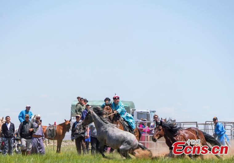 Trainers swing their lassos to catch spirited horses during a horse-taming competition in Xilin Gol League of north China's Inner Mongolia Autonomous Region. (China News Service/Wang Zhiwei)