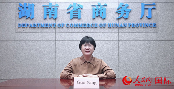 Guo Ning, deputy director-general of the Hunan Provincial Department of Commerce, delivers a speech via video link. (People's Daily Online SA/Liu Chang)