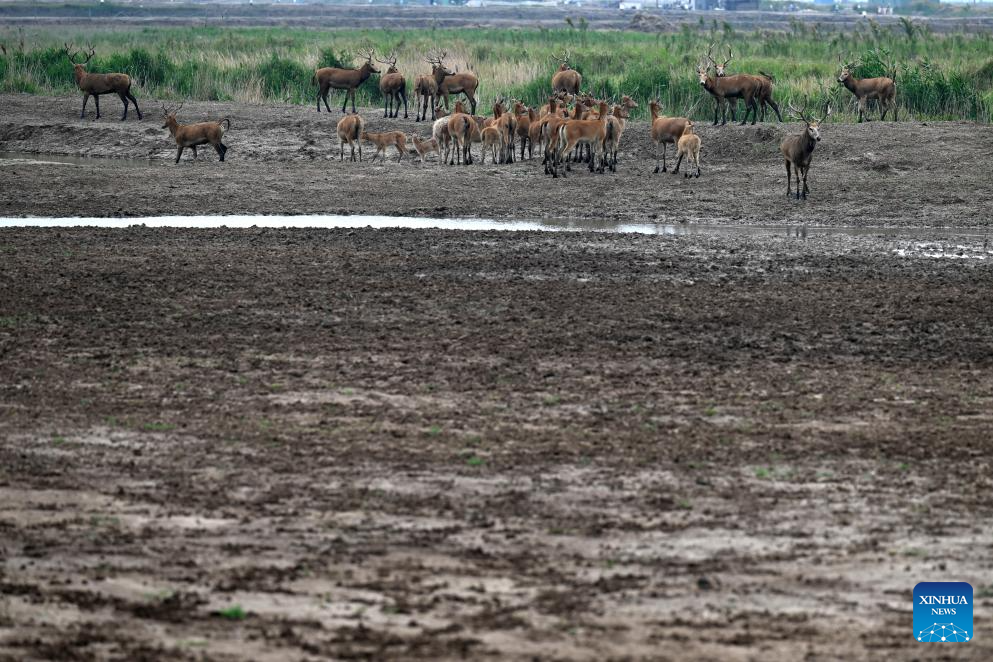 By the end of 2024, the milu deer population in the Yancheng reserve area had reached over 8,200, accounting for nearly 70 percent of the global milu deer population. (Xinhua/Cheng Tingting)