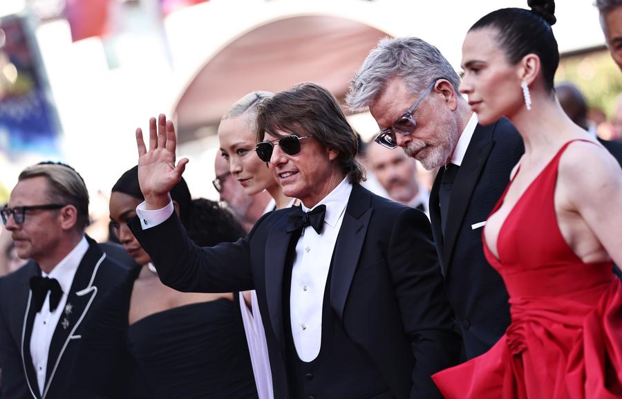 U.S. actor and producer Tom Cruise (3rd R) and cast members of the film "Mission: Impossible - The Final Reckoning" arrive on the red carpet for the world premiere of the film at the 78th edition of the Cannes Film Festival in Cannes, southern France, on May 14, 2025. (Xinhua/Gao Jing)