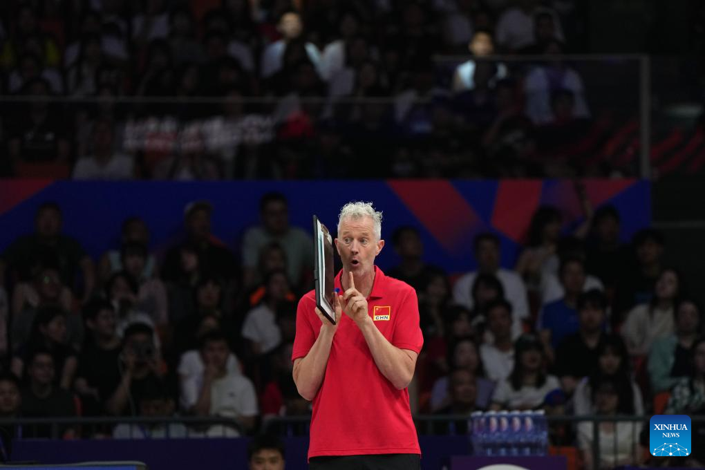 Head coach of China Vital Heynen gives instructions during the Pool 3 match between China and Japan at the Men's Volleyball Nations League (VNL) 2025 in Xi'an, northwest China's Shaanxi Province, June 11, 2025. (Xinhua/Li Yibo)
