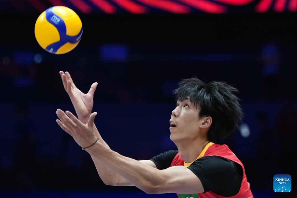 Peng Shikun of China serves the ball during the Pool 3 match between China and Japan at the Men's Volleyball Nations League (VNL) 2025 in Xi'an, northwest China's Shaanxi Province, June 11, 2025. (Xinhua/Li Yibo)