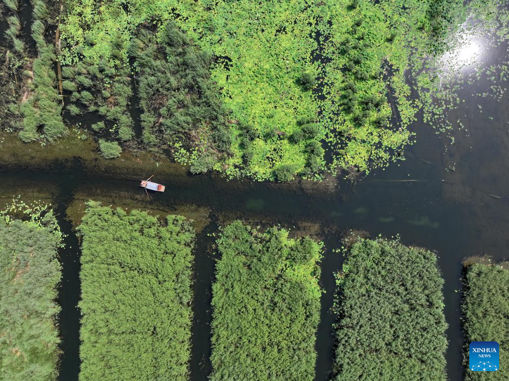 An aerial drone photo taken on June 11, 2025 shows boats sailing on Baiyangdian Lake, Xiongan New Area of north China's Hebei Province. Since the founding of Xiongan New Area, the water quality of Baiyangdian Lake has been greatly improved thanks to the systematic ecological governance. (Xinhua/Mu Yu)