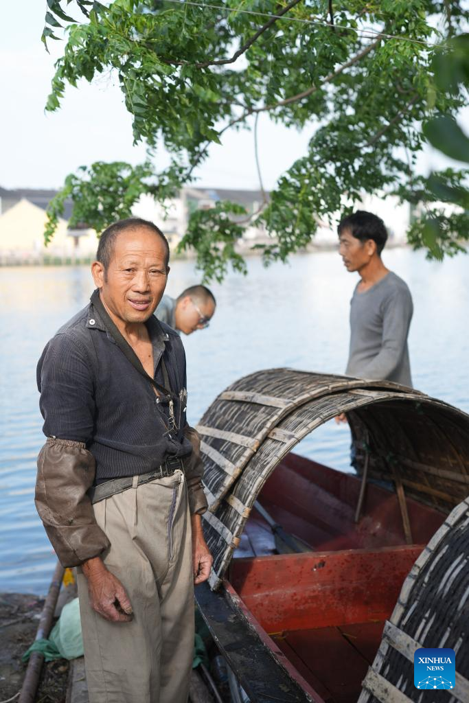 Qian Shoutang poses beside a black-awning boat he has made in Shaoxing, east China's Zhejiang Province, June 12, 2025. The black-awning boat is unique transportation means in Shaoxing with a long history. The making technique of the black-awning boat was inscribed on the list of provincial intangible cultural heritage of Zhejiang in 2009. Qian Shoutang, 68, is a representative inheritor of the technique in Shaoxing. Born in a family with a black-awning boat making tradition, Qian has engaged himself in making boats for over half a century. Currently, Qian and his apprentices make more than ten black-awning boats each year, primarily for use in scenic areas. "As more and more people, especially young generation, are fascinated with traditional culture, it is meaningful for me to pass down the technique," said Qian. (Xinhua/Weng Xinyang)