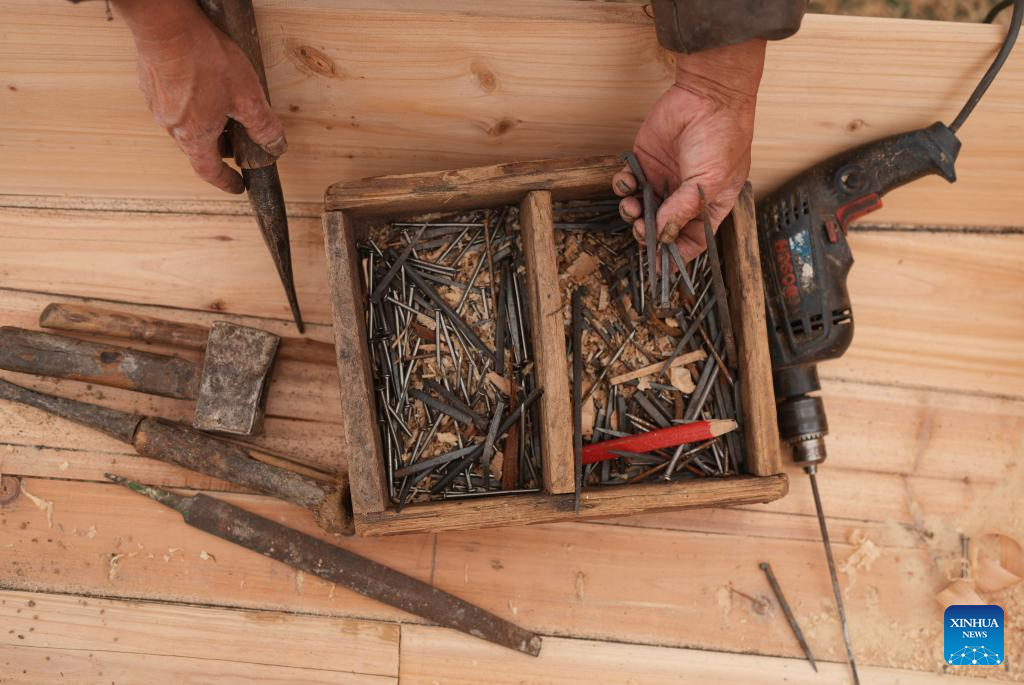 This photo taken on June 12, 2025 shows a toolbox of Qian Shoutang in Shaoxing, east China's Zhejiang Province. The black-awning boat is unique transportation means in Shaoxing with a long history. The making technique of the black-awning boat was inscribed on the list of provincial intangible cultural heritage of Zhejiang in 2009. Qian Shoutang, 68, is a representative inheritor of the technique in Shaoxing. Born in a family with a black-awning boat making tradition, Qian has engaged himself in making boats for over half a century. Currently, Qian and his apprentices make more than ten black-awning boats each year, primarily for use in scenic areas. "As more and more people, especially young generation, are fascinated with traditional culture, it is meaningful for me to pass down the technique," said Qian. (Xinhua/Weng Xinyang)
