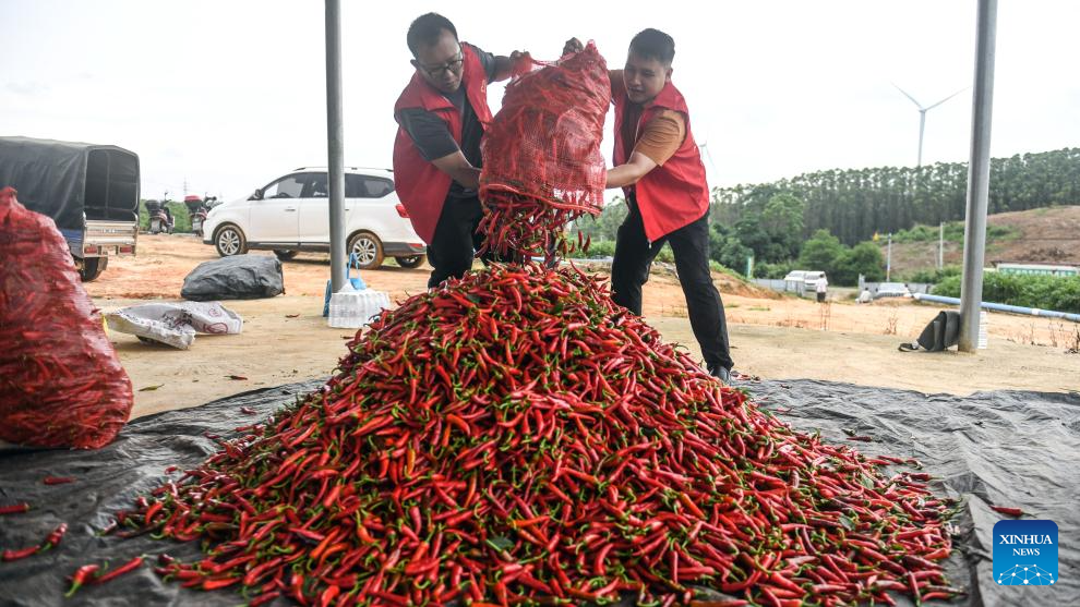 This photo taken on June 12, 2025 shows volunteers piling up harvested chili peppers in Youbu Village, Qinnan District, Qinzhou City, south China's Guangxi Zhuang Autonomous Region. (Xinhua/Zhang Ailin)