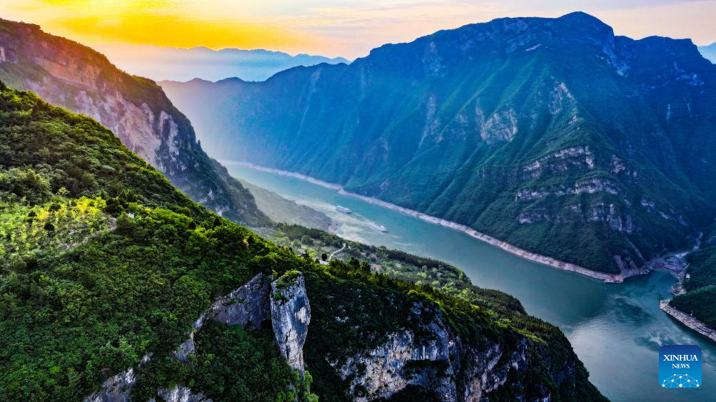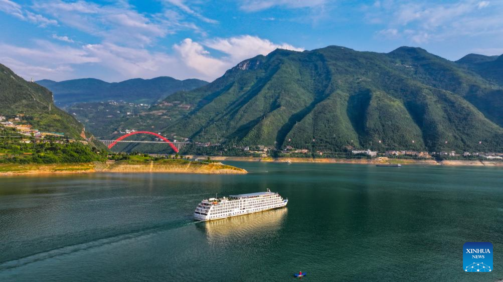 An aerial drone photo shows a cruise ship sailing in Wuxia Gorge, one of the Three Gorges on the Yangtze River, in southwest China's Chongqing Municipality, June 11, 2025. In recent years, Wushan, Fengjie, and other areas in the Three Gorges Reservoir region in Chongqing have adhered to the principle of green development. While consolidating the ecological strength in the upper reaches of the Yangtze River, local authorities have fully leveraged the unique terrain, magnificent landscapes, and rich historical and cultural heritage to promote the development of cultural tourism, effectively boosting local economic and social development. (Xinhua/Wang Quanchao)