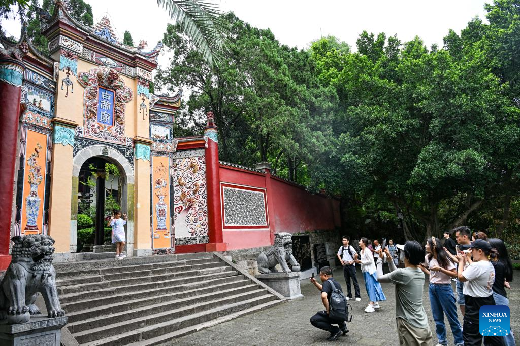 Tourists visit a scenic area in Fengjie County, southwest China's Chongqing Municipality, June 9, 2025. In recent years, Wushan, Fengjie, and other areas in the Three Gorges Reservoir region in Chongqing have adhered to the principle of green development. While consolidating the ecological strength in the upper reaches of the Yangtze River, local authorities have fully leveraged the unique terrain, magnificent landscapes, and rich historical and cultural heritage to promote the development of cultural tourism, effectively boosting local economic and social development. (Xinhua/Wang Quanchao)