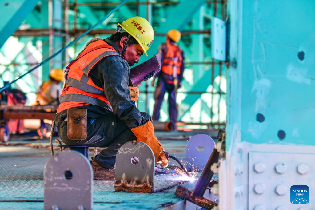 Workers build a sightseeing corridor at the construction site of the Huajiang Grand Canyon Bridge in southwest China's Guizhou Province, June 11, 2025. Tourism-related equipment at the Huajiang Grand Canyon Bridge is under construction.