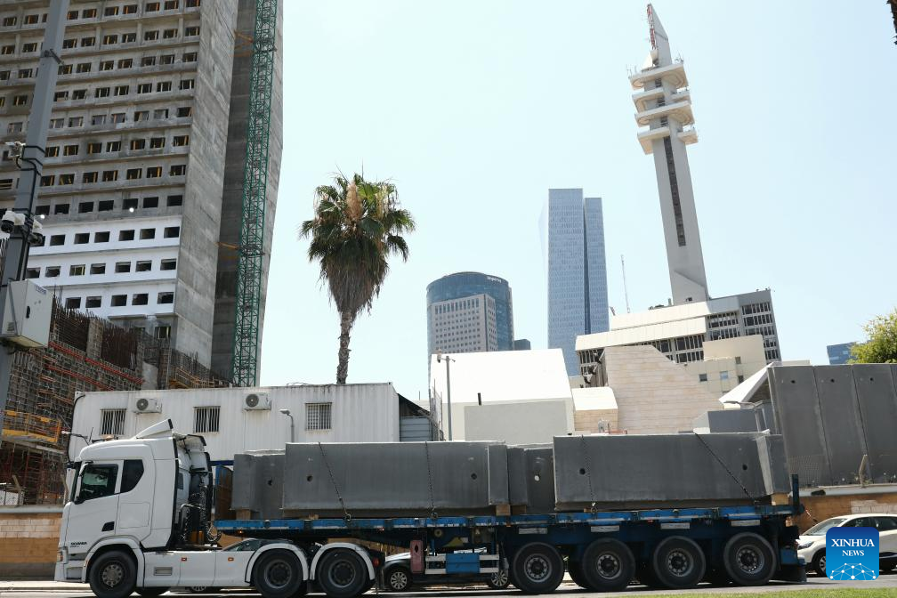 This photo taken on June 13, 2025 shows a truck carrying bunker walls on a street in Tel Aviv, Israel. The Israel Defense Forces (IDF) confirmed early Friday in a statement that it had launched a "preemptive, precise, combined" attack on dozens of military targets, including nuclear targets in different areas of Iran, adding, "Iran is closer than ever to obtaining a nuclear weapon." Following the attack, the IDF's Home Front Command prohibited educational activities and gatherings in Israel, except for essential sectors. (Gideon Markowicz/JINI via Xinhua)