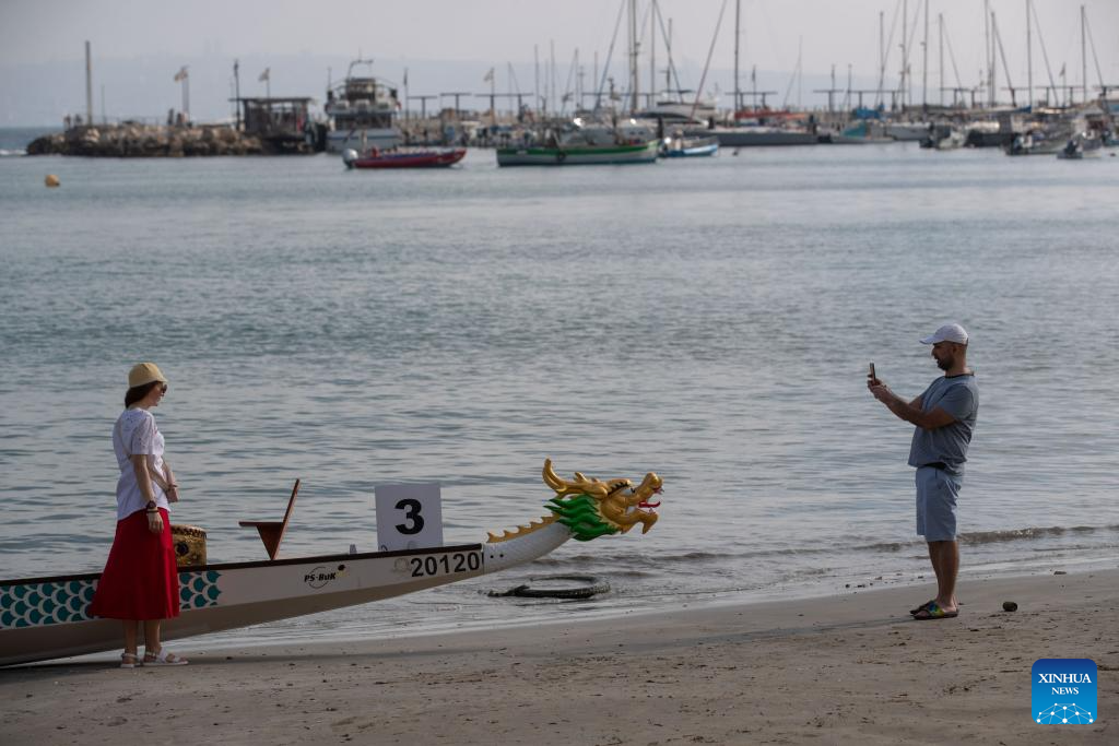 People paddle dragon boats during a dragon boat event in the northern Israeli city of Acre, June 12, 2025. A Chinese cultural event centered on dragon boat racing was held on Thursday in the ancient Israeli city of Acre. More than 300 participants competed in the traditional boat races along the Mediterranean coast. (Xinhua/Chen Junqing)