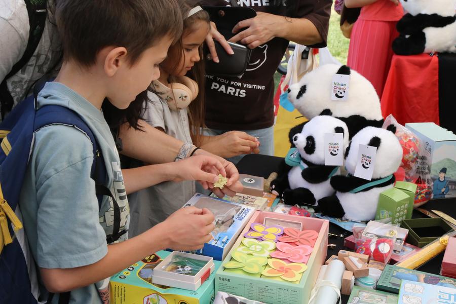 Children shop for Chinese cultural products at Asian Festival in Sofia, Bulgaria, June 14, 2025. (Xinhua/Lin Hao)