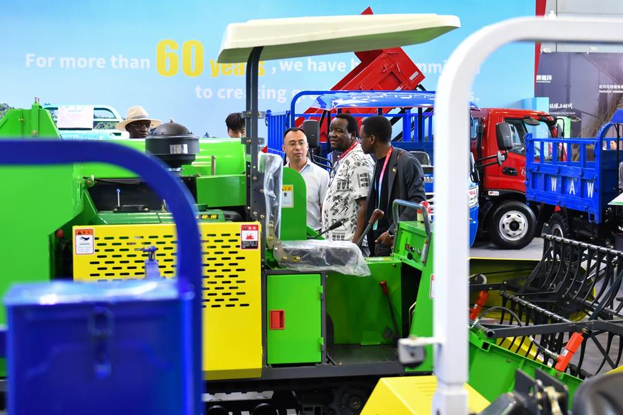 Visitors learn about an agricultural machine during the fourth China-Africa Economic and Trade Expo at Changsha International Convention and Exhibition Center in Changsha, central China's Hunan Province, June 14, 2025. (Xinhua/Chen Zhenhai)