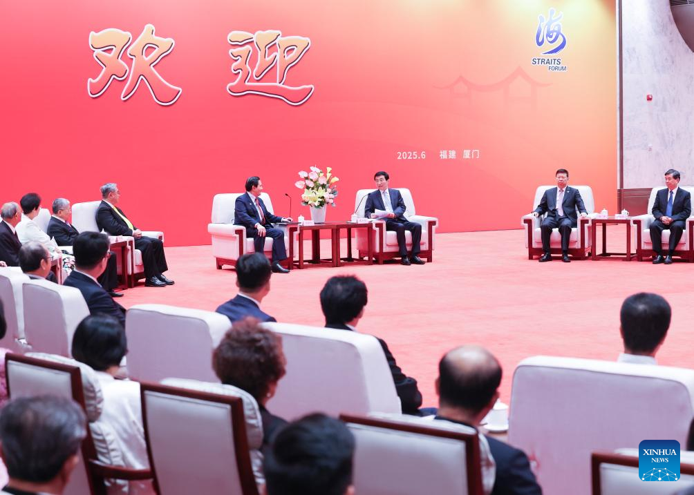 Wang Huning, a member of the Standing Committee of the Political Bureau of the Communist Party of China Central Committee and chairman of the National Committee of the Chinese People's Political Consultative Conference, meets with Ma Ying-jeou and other guests from Taiwan prior to the 17th Straits Forum in Xiamen, southeast China's Fujian Province, June 15, 2025. Wang addressed the 17th Straits Forum here on Sunday. (Xinhua/Yao Dawei)