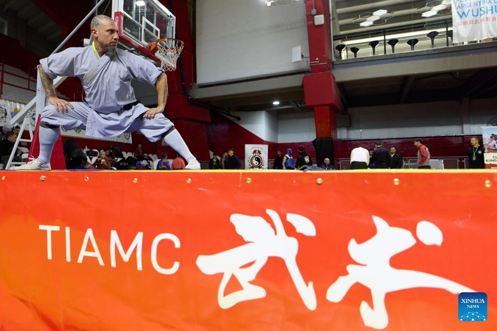 An athlete performs during the National Wushu Championships of Argentina in Buenos Aires, Argentina, on June 15, 2025. (Xinhua/Meng Dingbo)