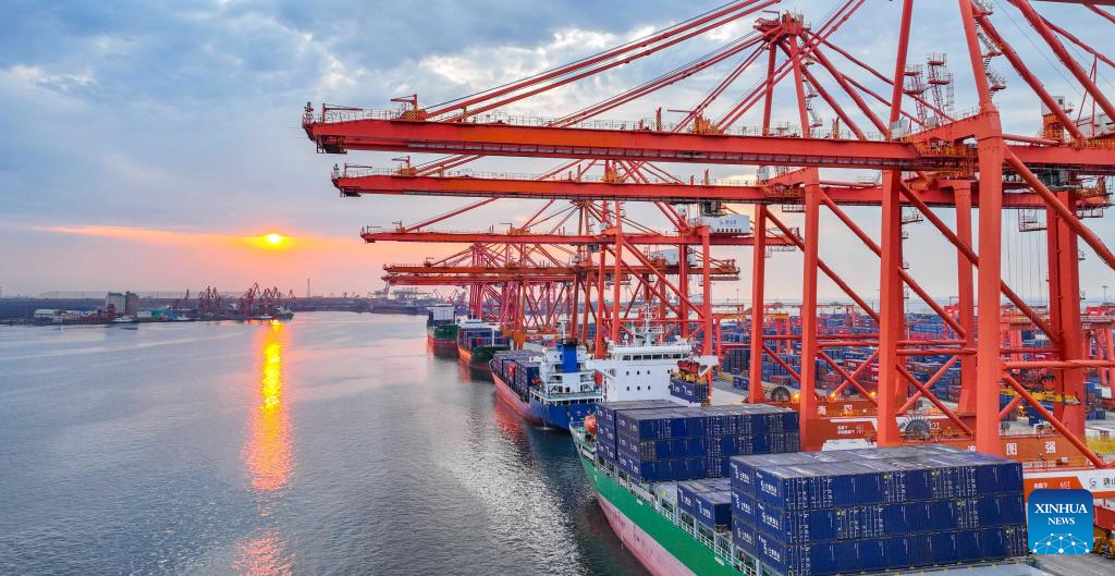 A drone photo taken on June 16, 2025 shows a view of the container terminal of Tangshan Port in Tangshan, north China's Hebei Province. China's value-added industrial output expanded 5.8 percent year on year in May. China's economy continued to expand steadily in May, supported by ongoing policy measures that helped sustain recovery amid global uncertainties, official data showed on Monday. (Photo by Liu Mancang/Xinhua)