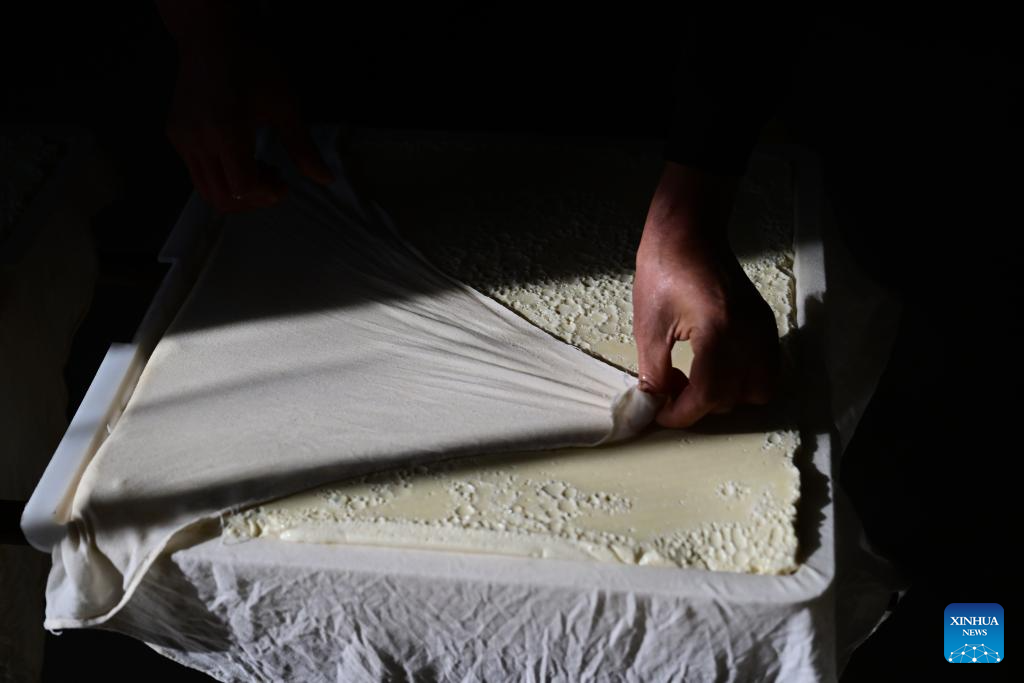 Hu Xuebing, a provincial intangible cultural heritage representative inheritor of the traditional tofu making skills, makes tofu at Daquan Village of Bagongshan Township in Shouxian County, Huainan City, east China's Anhui Province, Apirl 8, 2025. (Xinhua/Zhou Mu)