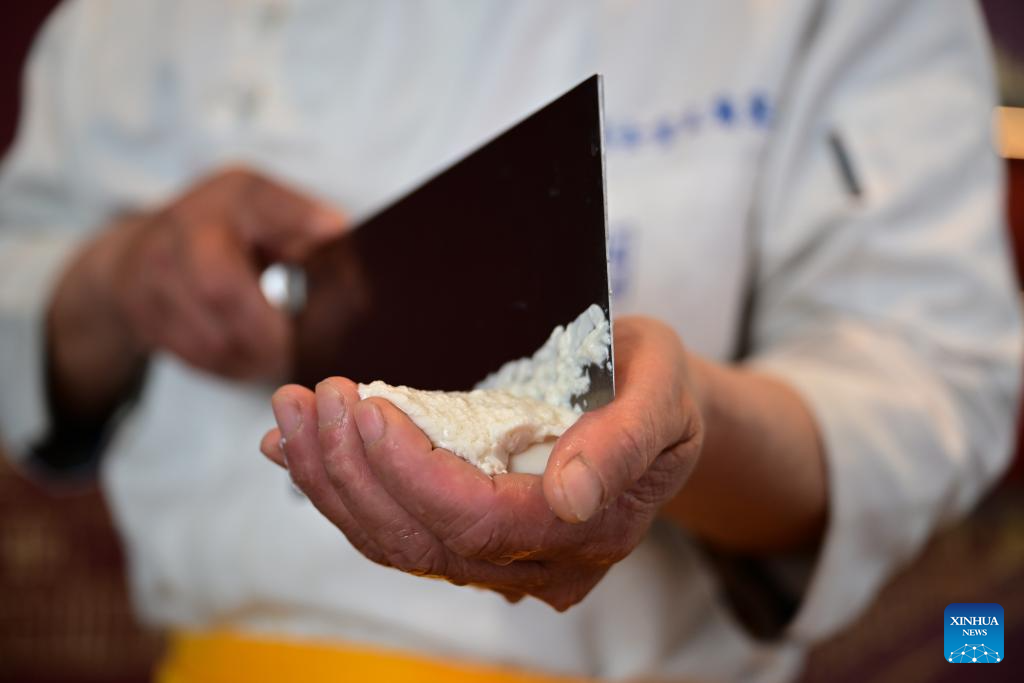 Zhang Shihong, an inheritor of the tofu banquet making skills, makes tofu dumplings in Shouxian County, Huainan City, east China's Anhui Province, April 8, 2025. (Xinhua/Zhou Mu)