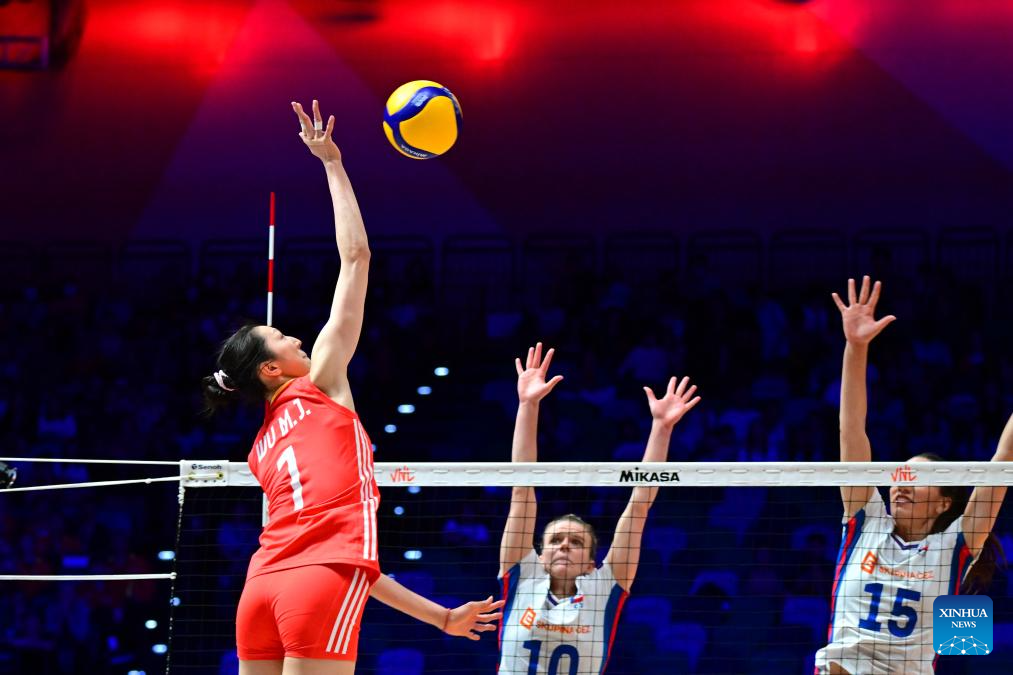 Michaela Mlejnkova (L) of the Czech Republic spikes the ball during the Pool 5 match between China and the Czech Republic at the Women's Volleyball Nations League (VNL) 2025 in Hong Kong, China, June 18, 2025. (Xinhua/Zhu Wei)