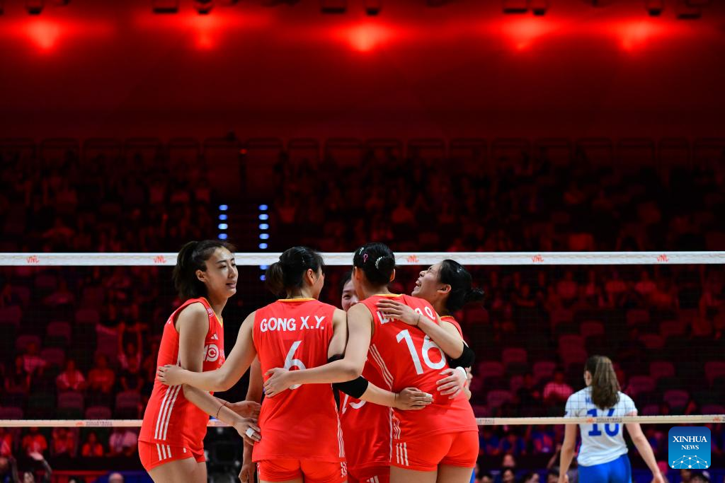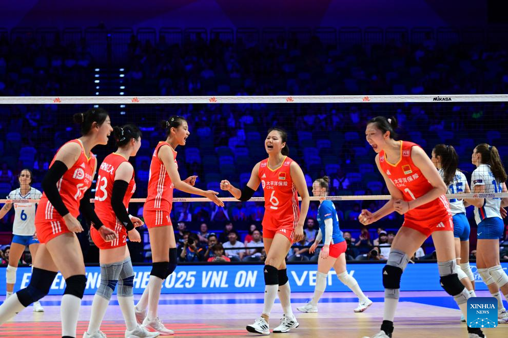 Players of China celebrate during the Pool 5 match between China and the Czech Republic at the Women's Volleyball Nations League (VNL) 2025 in Hong Kong, China, June 18, 2025. (Xinhua/Zhu Wei)