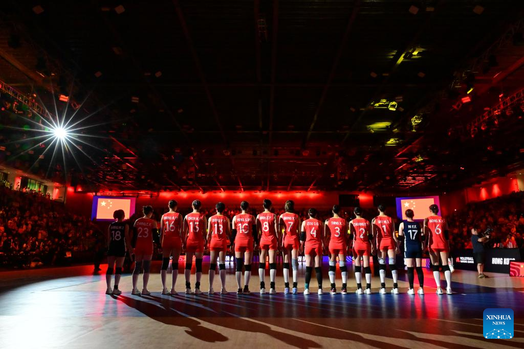 Players of China stand in line for the national anthem before the Pool 5 match between China and the Czech Republic at the Women's Volleyball Nations League (VNL) 2025 in Hong Kong, China, June 18, 2025. (Xinhua/Zhu Wei)