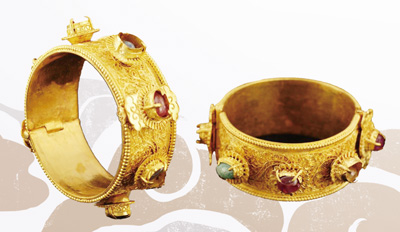 Photo shows gold bracelets inset with gemstones from the Ming dynasty (1368-1644) held in the Hubei Provincial Museum, central China's Hubei Province. (Photo courtesy of Lu Li)
