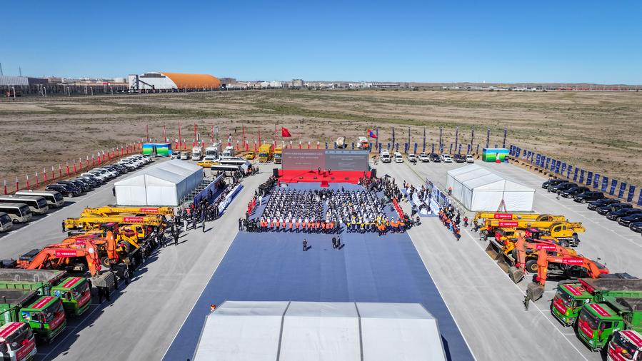An aerial drone photo taken on May 14, 2025 shows people attending the groundbreaking ceremony of the Ganqmod-Gashuun Sukhait Railway, a railway linking Ganqmod Port in north China's Inner Mongolia Autonomous Region and Mongolia's Gashuun Sukhait, at Ganqmod Port in the city of Bayannur, north China's Inner Mongolia Autonomous Region. (Xinhua)