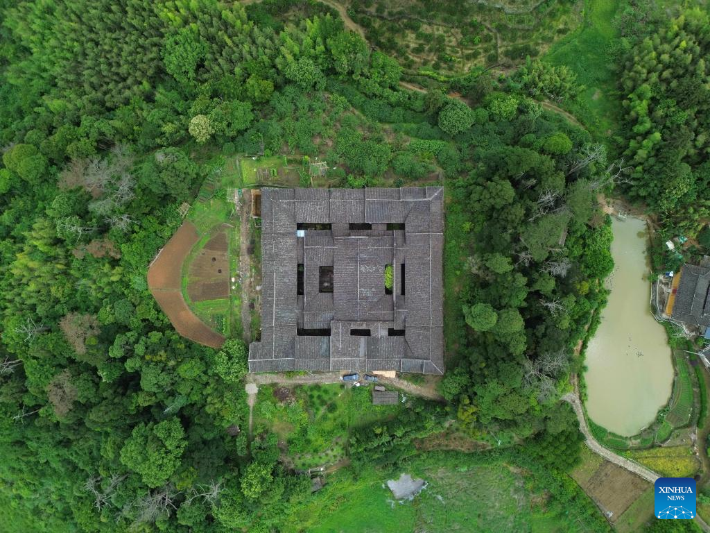 An aerial drone photo taken on May 20, 2025 shows Hecheng Manor in Yongtai County, southeast China's Fujian Province. Nestled in the Daiyun Mountain like scattered pearls, over 2,000 fortified manors in Yongtai County trace their origins to the Tang Dynasty (618-907 AD), flourishing later during the Ming (1368-1644) and Qing (1644-1911) eras.