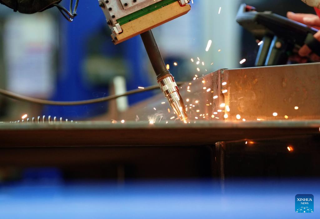 This photo taken on June 20, 2025 shows a new type of robot intelligent welding system doing welding tests at Tianjin intelligent manufacturing base of Offshore Oil Engineering Co., Ltd. in north China's Tianjin. As a national manufacturing R&D base, Tianjin has been making efforts in recent years to make leading enterprises play a role in improving and upgrading of the marine equipment industry. Relevant enterprises have realized transformation towards high-end, intelligent and greening development through upgrading their automated equipment and renovating their intelligent workshops. (Xinhua/Zhao Zishuo)