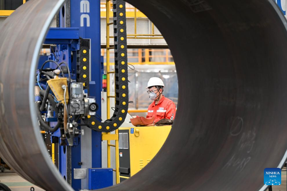 A staff member operates a welding robot at the pipe-making workshop of Tianjin intelligent manufacturing base of Offshore Oil Engineering Co., Ltd. in north China's Tianjin, June 20, 2025. As a national manufacturing R&D base, Tianjin has been making efforts in recent years to make leading enterprises play a role in improving and upgrading of the marine equipment industry. Relevant enterprises have realized transformation towards high-end, intelligent and greening development through upgrading their automated equipment and renovating their intelligent workshops. (Xinhua/Zhao Zishuo)