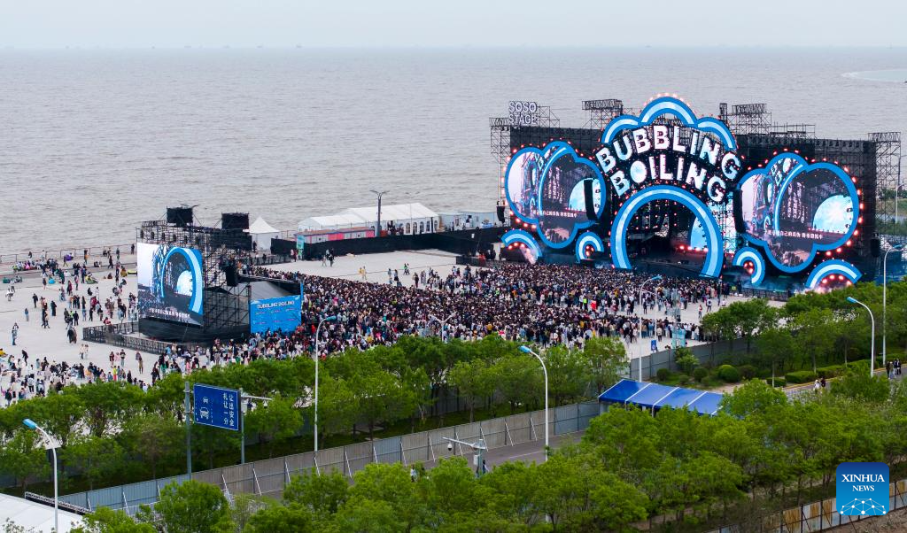 A drone photo taken on May 3, 2025 shows a concert held at a seaside park in Binhai New Area in north China's Tianjin. In recent years, Binhai New Area in Tianjin has made great efforts to protect ecological environment and upgraded the layout of parks. Several seaside landmarks in Binhai have become popular tourist destinations. (Xinhua/Zhao Zishuo)