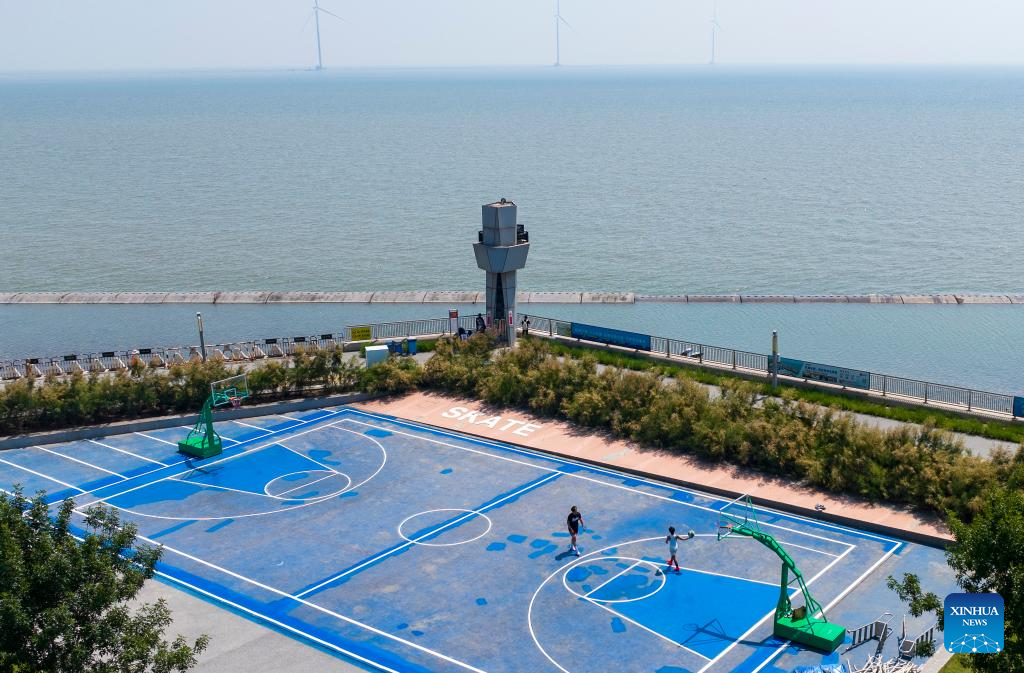 A drone photo taken on June 21, 2025 shows people playing basketball at a seaside park in Binhai New Area in north China's Tianjin. In recent years, Binhai New Area in Tianjin has made great efforts to protect ecological environment and upgraded the layout of parks. Several seaside landmarks in Binhai have become popular tourist destinations. (Xinhua/Zhao Zishuo)