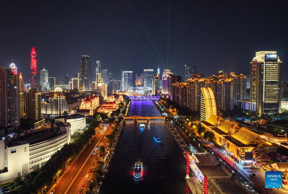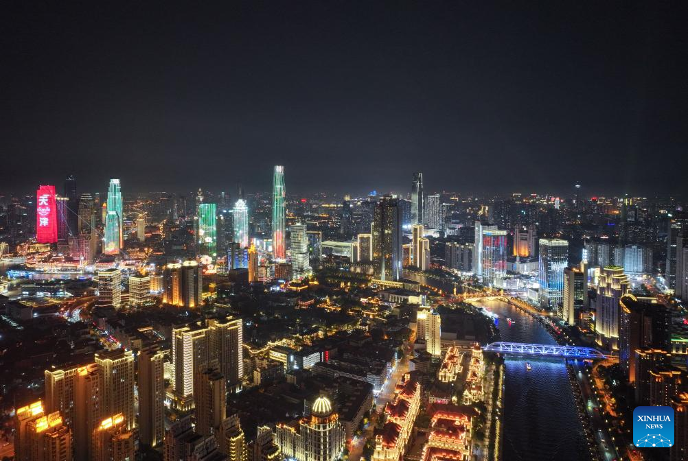 An aerial drone photo taken on June 21, 2025 shows a city view by the Haihe River at night in north China's Tianjin Municipality.