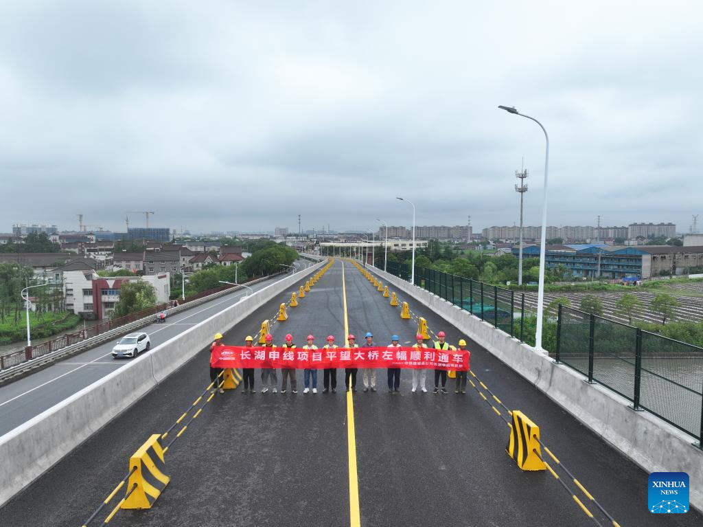 The left lanes of the newly-built Pingwang Bridge, a project of the east part of the Chang-Hu-Shen (Changxin-Huzhou-Shanghai) navigation channel (Jiangsu section) improvement project, was officially opened to traffic on Monday. (Xinhua/Ji Chunpeng)