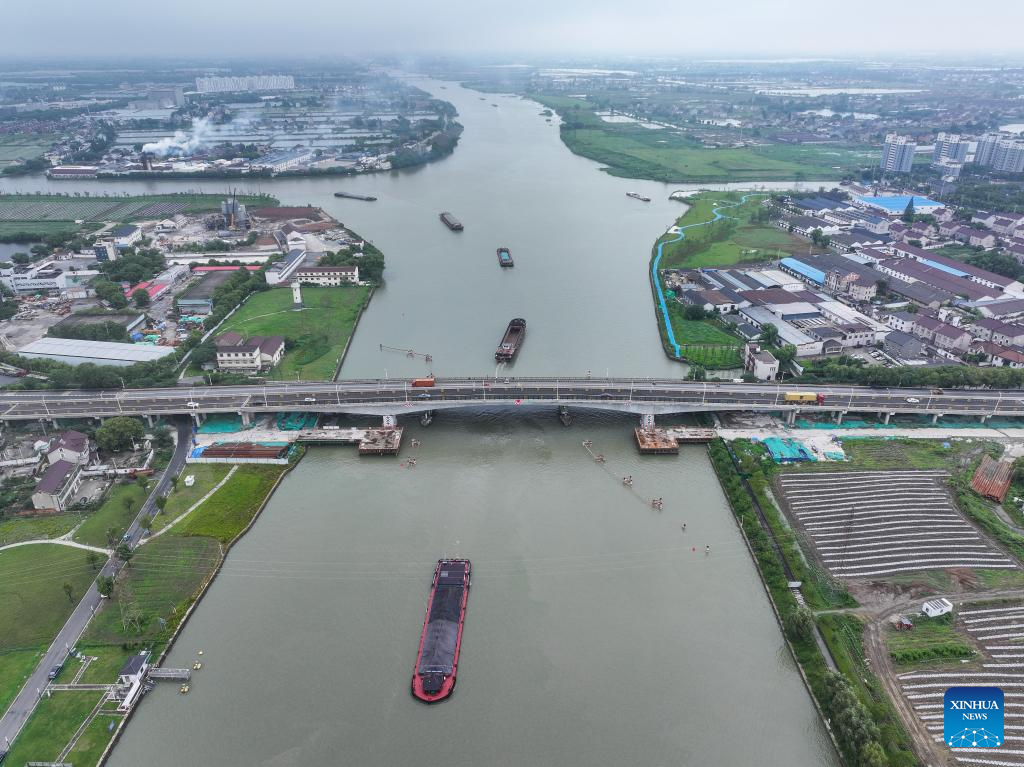 An aerial drone photo taken on June 23, 2025 shows a view of the Pingwang Bridge in Wujiang District of Suzhou City, east China's Jiangsu Province.