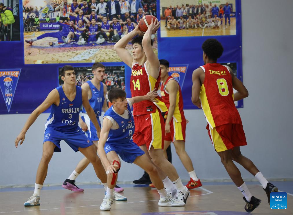 China's Huan Sinan (C) jumps for the ball during a friendly basketball match between Serbia U18 and China U19 in Cajetina, Serbia, on June 23, 2025. (Photo by Predrag Milosavljevic/Xinhua)