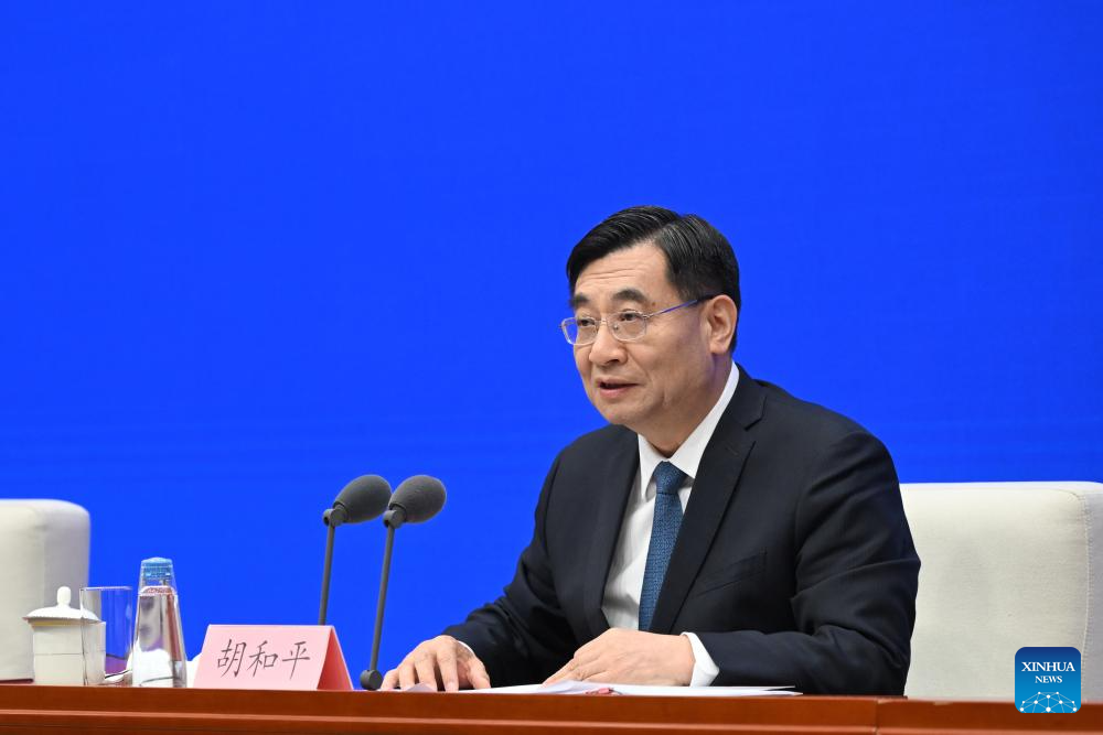 Hu Heping, executive vice minister of the Publicity Department of the Communist Party of China Central Committee, speaks at a press conference held by China's State Council Information Office on plans for marking the 80th anniversary of the victory in the Chinese People's War of Resistance Against Japanese Aggression and the World Anti-Fascist War, in Beijing, capital of China, June 24, 2025. Hu and Major General Wu Zeke (not in the picture), deputy director of the Leading Group Office of Military Parade and deputy director general of the Operation Bureau of the Joint Staff Department of the Central Military Commission, briefed the media on the arrangement of commemorative activities and took questions. (Xinhua/Jin Liwang)
