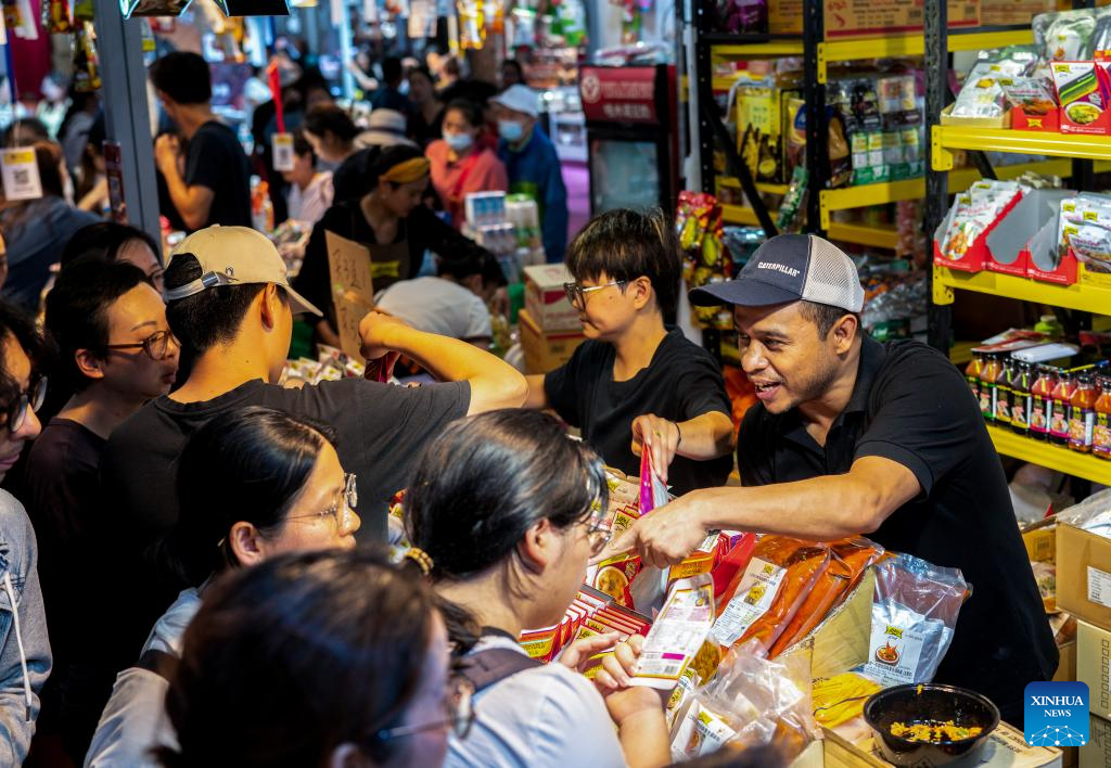 Visitors select products during the 9th China-South Asia Expo in Kunming, southwest China's Yunnan Province, June 24, 2025. The 9th China-South Asia Expo came to an end on Tuesday. A total of 153 agreements have been signed as of 12: 00 on June 24, with the total value of foreign trade contracts reaching 8.479 billion yuan (about 1.18 billion U.S. dollars). (Photo by Peng Yikai/Xinhua)