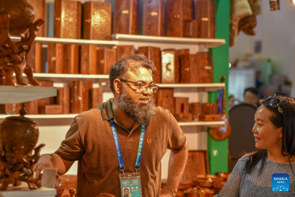 A Pakistani exhibitor introduces furniture during the 9th China-South Asia Expo in Kunming, southwest China's Yunnan Province, June 24, 2025. The 9th China-South Asia Expo came to an end on Tuesday. A total of 153 agreements have been signed as of 12: 00 on June 24, with the total value of foreign trade contracts reaching 8.479 billion yuan (about 1.18 billion U.S. dollars). (Photo by Peng Yikai/Xinhua)