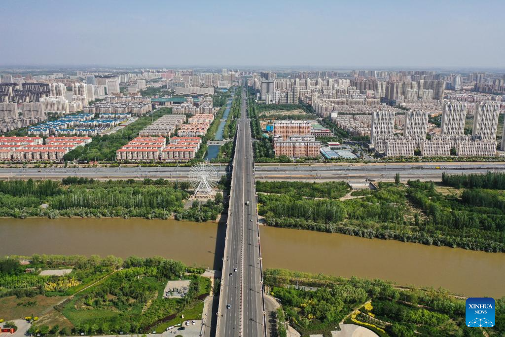 An aerial drone photo taken on May 28, 2025 shows the Sanshenggong Water Control Project in Dengkou County of Bayannur, north China's Inner Mongolia Autonomous Region. (Xinhua/Li Zhipeng)